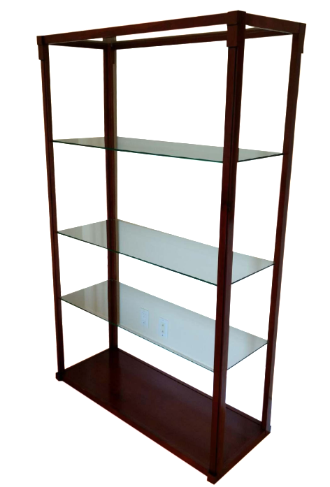 Adjustable wood shelves behind doors, adjustable levelers, cord vent slot, 600-939 Cowley Etagere W40 D17 H82 Eight wood shelves Shelf sizes (top to bottom) Shelf 1: Crafted of Cherry veneers and Poplar solids in a dark umber brown finish with ... Read Content