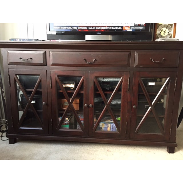 Chippendale-inspired media cabinet in cherry finish, the rectangular swivel top over component storage to lower cabinet, raised on casters, Chippendale style solid wood dresser, the tall rectangular case fitted with six drawers over bracket ... Access Content
